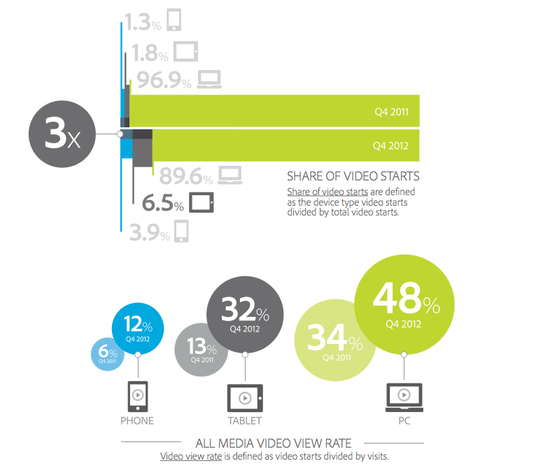Overall, digital video saw growth across all platforms, with an increase of 30 percent year over year in Q4 2012 versus the same time in 2012. TV and sports content was responsible for a large chunk of that new viewership, and streaming video available has grown 50 percent between Q1 2011 and Q4 2012. Smartphones and tablets were both among the biggest growth categories in terms of devices, and now account for more than 10 percent of all video starts combined, the first time they’ve reached that high of a share. Though both smartphone and tablet views have increased over the past couple of years, tablet viewing is accelerating at a faster rate and has already begun to pull away from phones.
