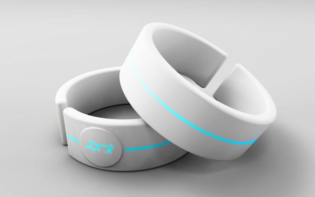 The two devices it’s planning are the Jomi Band, which will be the more basic of the pair (pictured above in an early design concept render, and below right in prototype form). This will attach around a water bottle and remind the user at pre-set intervals to take a sip (presumably by flashing/beeping). The second more pro product — the Jomi Sleeve — will attach to the bottom of the bottle and, in addition to reminders, will periodically weigh the bottle, to figure out how much water is being consumed. The data will then be sent via Bluetooth to a mobile/tablet app so that pro users can geek out over graphs and charts showing their beverage consumption data (and share their relative ‘liquidity’ with friends).
