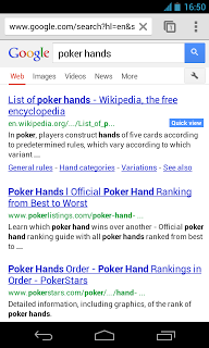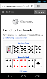 Along with those Quick links, Google is experimenting with something it calls “Quick view” which shows a badge that links to a bit of information pulled directly from Wikipedia. In this example, a Google search can be used as a “cheat sheet” for things like a list of poker hands: