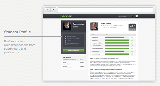 Today, Endorse.me is available exclusively as a cloud-based online service, but over the summer, the startup plans to begin developing mobile apps, which it expects to have ready in the fall. The service is currently free for students, employers, and all those intermediaries who choose to write recommendations for students. Again, the service is currently free for employers, but as the startup looks to monetize down the road, it will eventually began charging employers for access to student info.