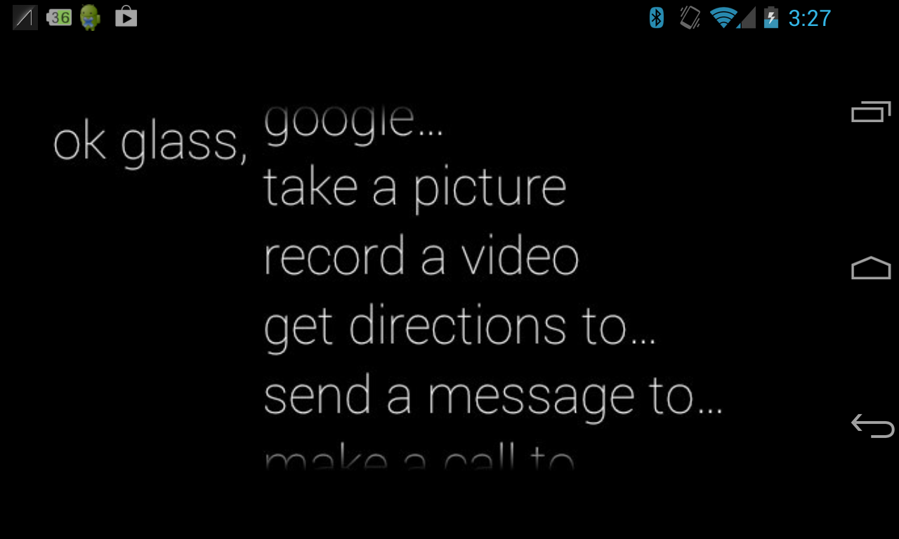 Something to note, all of these screenshots are coming from the handy “screencast” tool within the MyGlass app. It shows everything that you’re seeing on Glass. You’re paired, account is connected, Wi-Fi or mobile network is chosen, and you’re ready to use Glass.