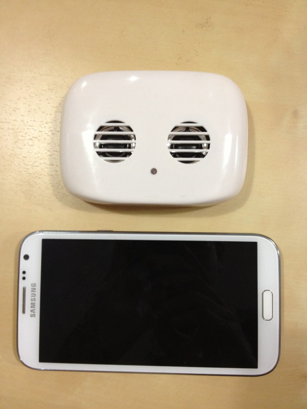 The white device here (pictured next to a phone for scale) is in the process of getting mounted on store walls in Singapore malls. When active, the device will emit an ultrasonic signal that an app can pick up, and will allow participating stores to broadcast deals and rewards to shoppers.