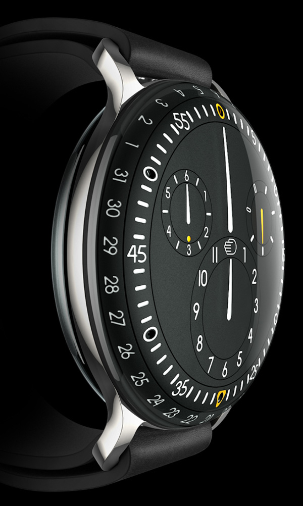 Because I like sharing cool watches with you guys I decided to share this cool watch with you guys. It’s called the Ressence Type 3 and it’s actually a liquid-filled mechanical watch with a nearly featureless face. Each of those dials – registers in the parlance – look like they are seamlessly embedded in the face surface and the watch, being suspended in synthetic oil, has no crown and is wound automatically.