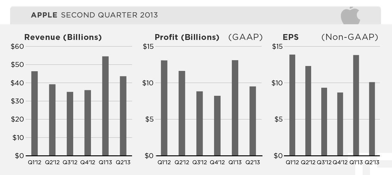 The Cupertino company has just released its fiscal Q2 2013 earnings — it reported $43.6 billion in revenue (up from $39.2 billion in the year-ago quarter) along with $9.5 billion in quarterly net profit, which works out to earnings of $10.09 per share.