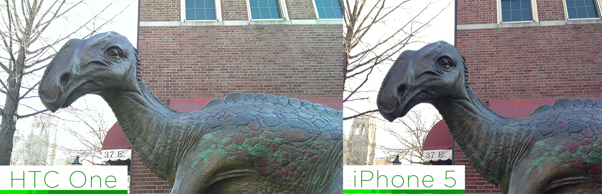 Speaking of competitors, the camera sensors in most of them struggle in low light but the One manages to dodge those issues rather nicely. It’s surprisingly good at capturing light even when it’s in short supply and manages to do so without introducing much grain into the situation. It’s worth noting that the ability for the One’s sensor to pick up as much light as it does has an impact on color reproduction. Consider the comparison shot with the iPhone 5 above — the One captures more of the scene, but some details (like the tree branches in the bottom left corner of the photo) are lost because of overexposure.