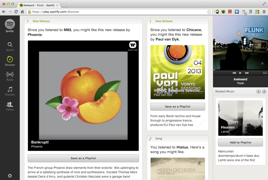 Back in December 2012, music streaming service Spotify provided an update on how it was going to double down on social recommendations to increase music listening on its platform by launching two new features, Follow and Discover. While the Follow feature, aimed at friends, started to get rolled out in March and April, it turns out that Spotify has also been rolling out the Discover feature.