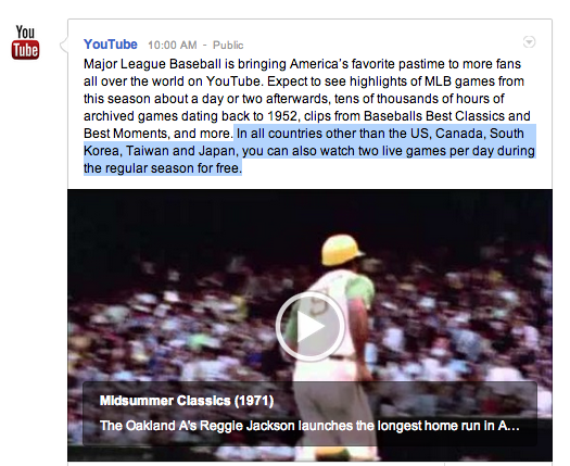 Naturally, it seems a little ill-conceived for the partnership to be announced without the ability to air in the U.S., Japan or South Korea, which happen to have two of the largest markets for baseball in the world. That being said, it’s a great start, and baseball fans will appreciate the ability to find highlights from their favorite players and teams on YouTube, just one click away from cute cat videos.