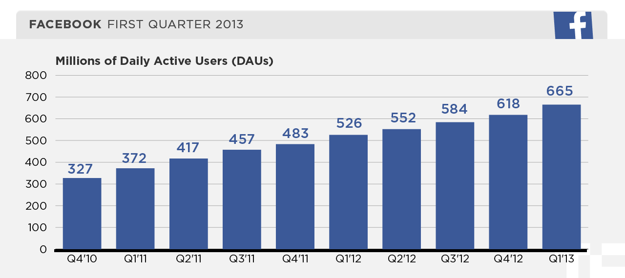 – Daily active users (DAUs) were 665 million on average for March 2013, an increase of 26% year-over-year.
