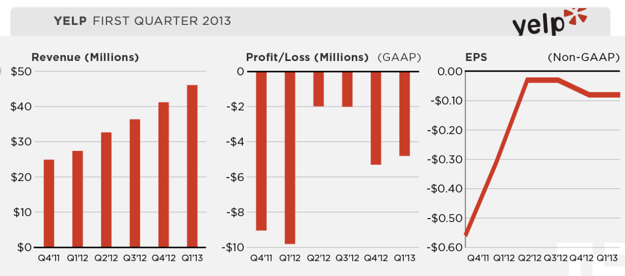 Wall Street’s consensus estimates were that Yelp would see $44.5 million in revenue for the quarter, and $1.5 million EBITDA. Yelp hurdled over the bar, in fact, seeing a net loss in the first quarter of 2013 of $4.8 million, or $0.08 per share. This means that while net losses only fell slightly from Q4 2012, it saw a more significant reduction in losses year-over year, $9.8 million, or $0.31 per share, over the first quarter of 2012.