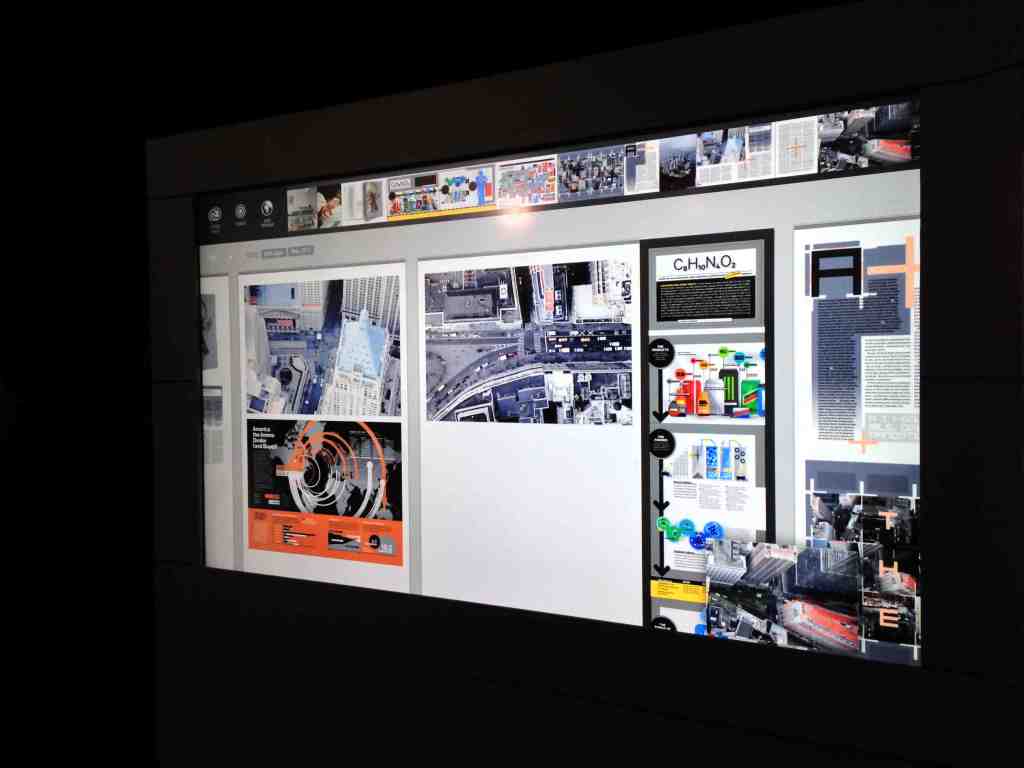 The Context system uses two 1080p high-def screens with a frame around it for picking up touch signals, as well as another screen set up as a Surface-like table in front of the other two screens. Because the screens are so large, you can actually see the individual pixels, but Macy hopes that once 4k screen become more affordable, that won’t be an issue.
