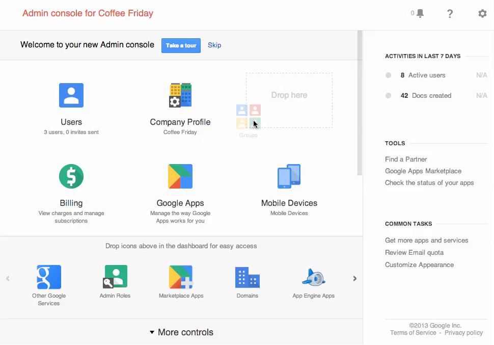 Some of the things being introduced in the Admin Console, which rolls out in a few weeks, include a universal search bar, new usage and activity stats at a glance, some bulk user actions and a customizable dashboard. The dashboard will let admins drag-and-drop the areas of Apps that they use the most, making it easier to do things like add new users or help employees out with password issues: