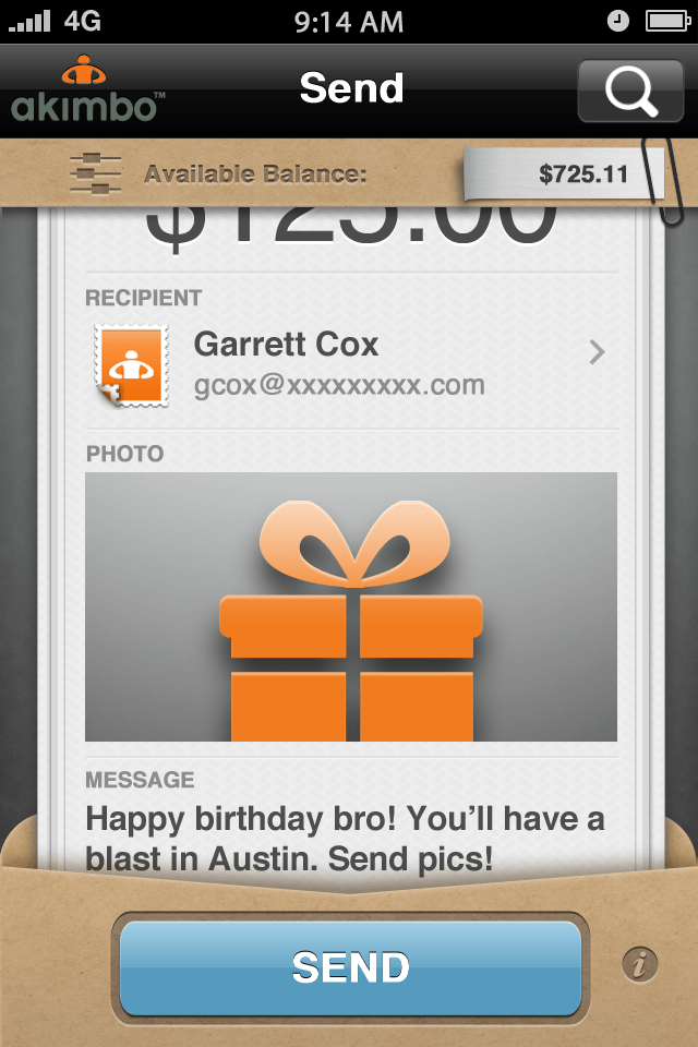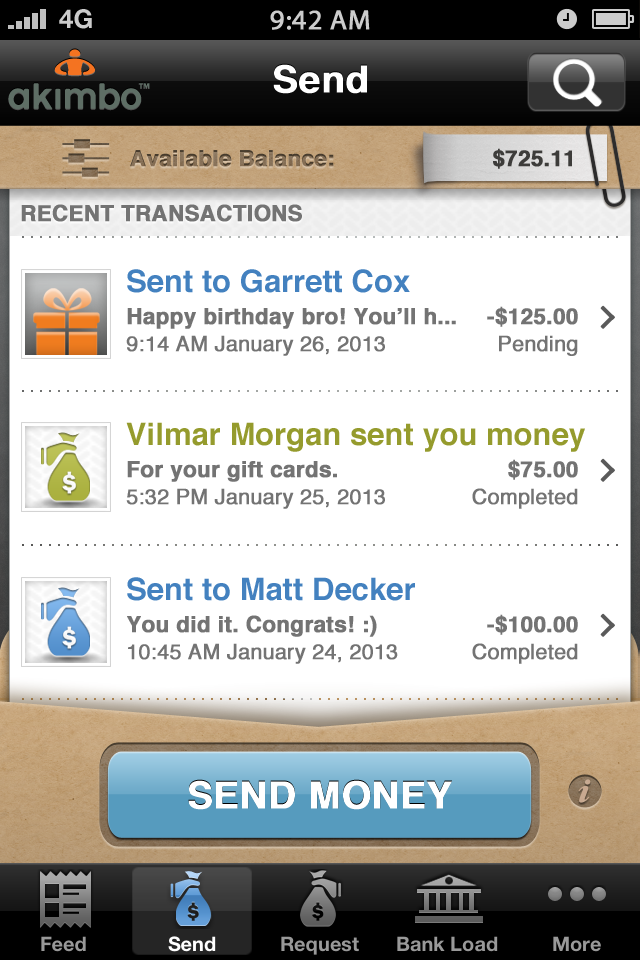 Like LevelUp, Akimbo wants to stand out from the pack by offering a fee-free platform through which users can send and request money to any email address, Facebook friend or mobile phone. Simply put, it’s PayPal meets a Visa pre-paid card. In other words, Akimbo allows users to access transferred funds from ATMs and any location that accepts Visa debit cards. In an effort to target the some 10 million young people who use prepaid credit cards, Akimbo enables users to link and load the card with their bank accounts with cash or via direct deposit.