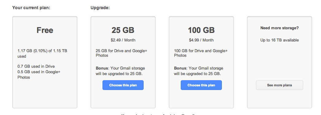 Here’s a look at the existing dashboard, which doesn’t push the 200GB option like the new one does, and still lists the 25GB upgrade, which also bumped your Gmail storage up. Confusing, right?