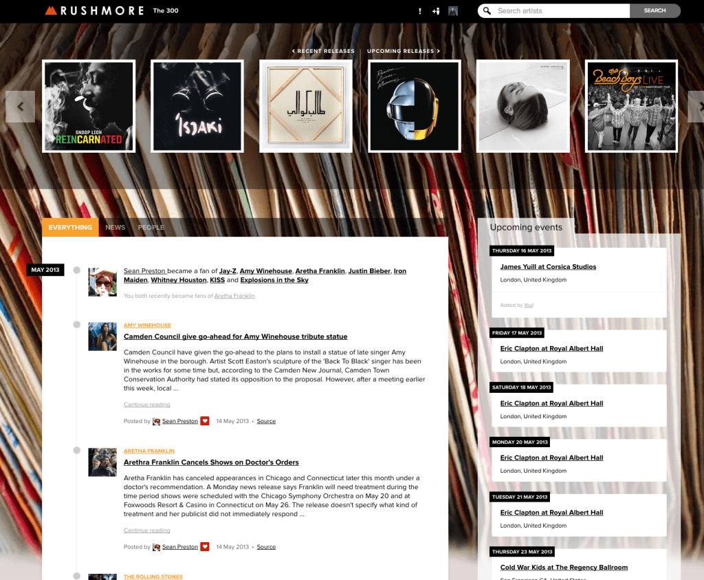 As Rushmore stands today, the site uses a “follow” model to provide a way for music fans to stay up to date with news, live events, and new releases from their favourite artists. The clincher is that, collectively, they’re also the ones doing most of the work in the sense that content is at least partially based on user contributions (pages have a Wiki-esque “edit” button, though I’m told that contributors will always be invite-only), while Rushmore is rewarding fans who add content via virtual and unspecified real world rewards. There’s a sprinkling of gamification, too. Each week fans compete for the top spots on “The 300”, described as a “highly competitive chart of Rushmore’s top users”.