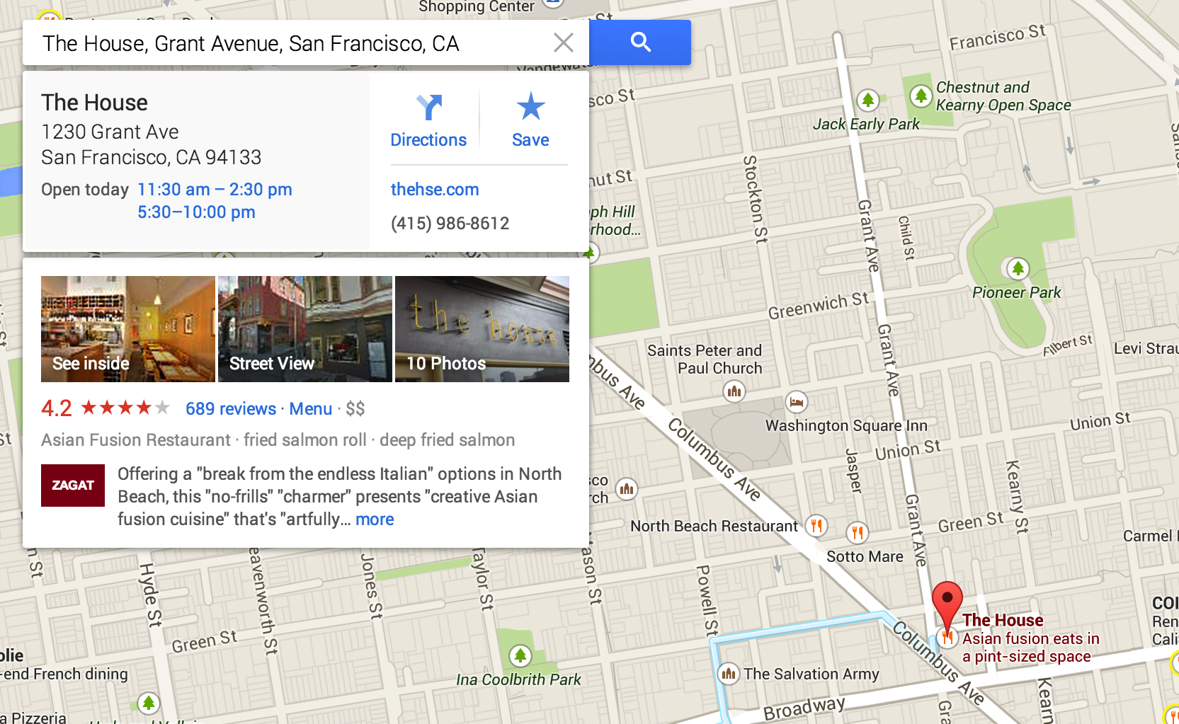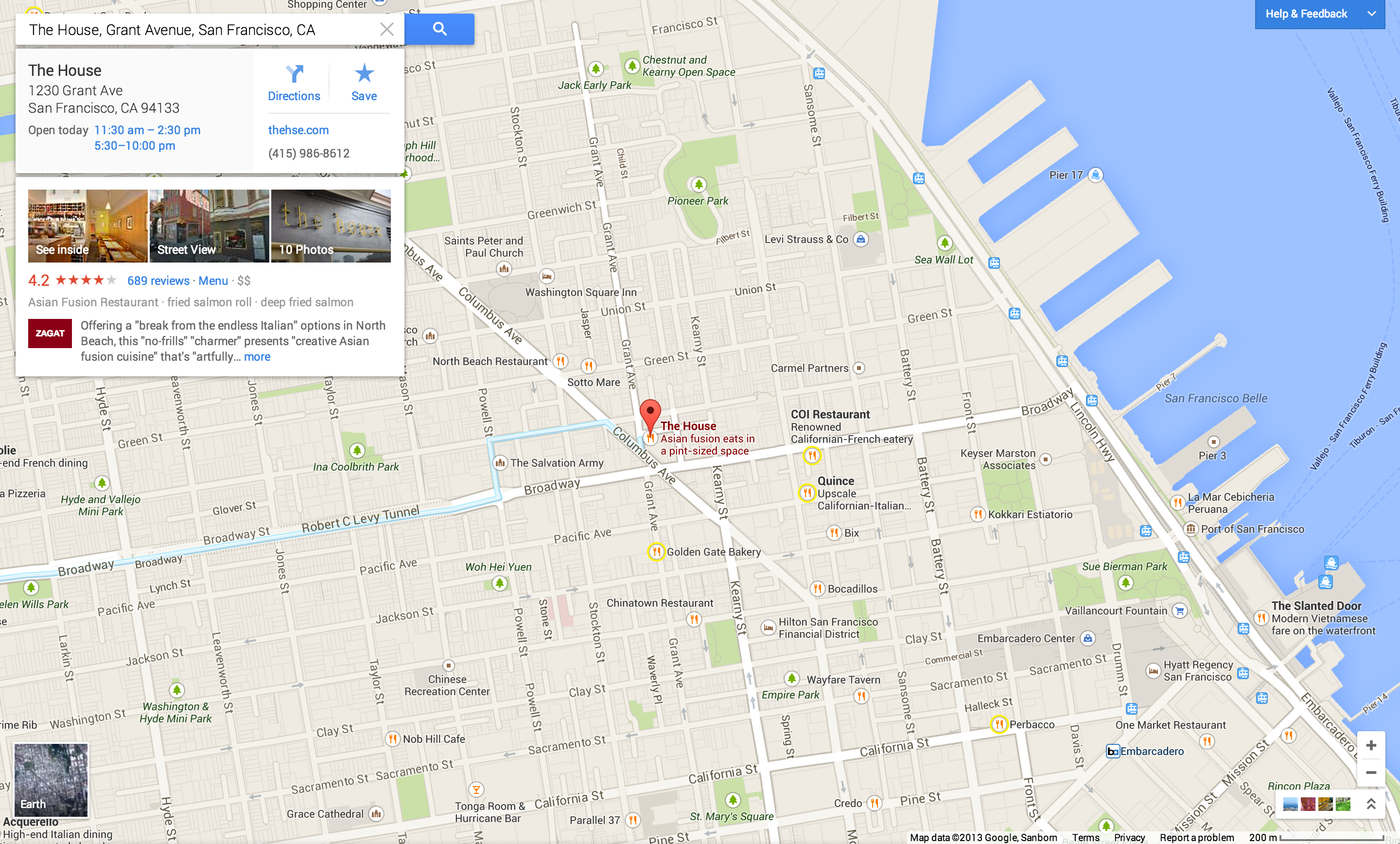 As you click around the map, drilling into specific areas, the screen is redrawn to adapt to your personal interests and tastes. This approach makes all of Google’s previous offerings seem static. When you click on a point of interest, like a restaurant, you’re doing so from the map itself, and a Google Now style card pops up on the left-hand side with user and Zagat ratings, reviews from your friends and quick entry points to photos of the venue from Street View, both inside and outside of the venue: