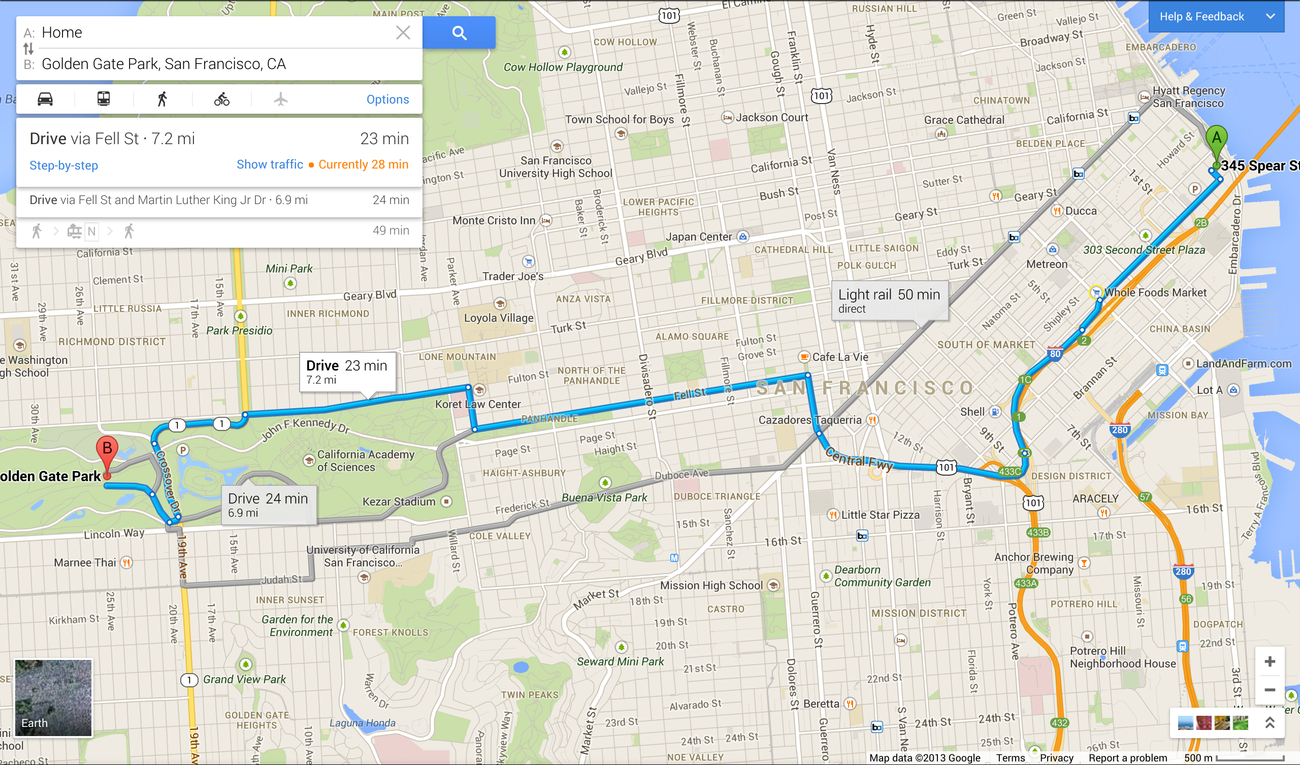Here’s a neat trick, too: If you want to go from point A to point B and don’t have the exact addresses, you can simply click on the map to plot it out on the fly. This is something that I’ve wanted to do on any decent mapping product for quite a while, since dense cities like San Francisco are easy enough to navigate if you know the general direction in which you want to go.