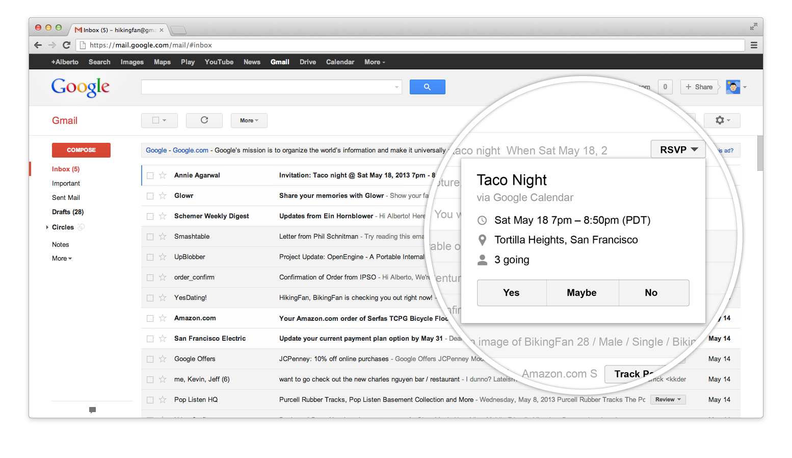 Google says developers could, for example, use this for confirmation emails when somebody registers to a site, or they could present magazine subscribers with a one-click action to renew their subscriptions or review a product, movies, restaurants or services. Developers could also use this to augment flight confirmation emails and allow users to respond to a meeting invitation right from the inbox without ever opening the email.
