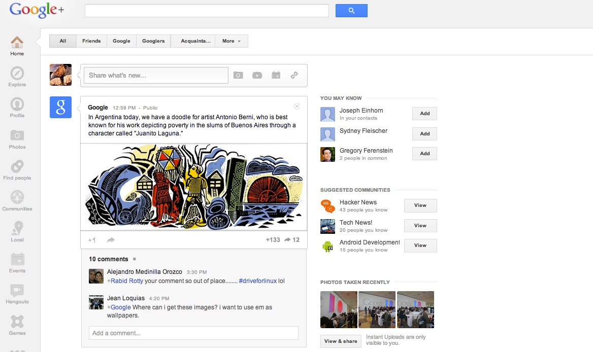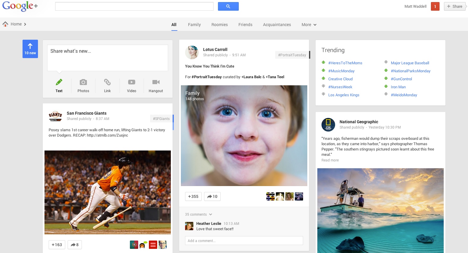 The stream changes will be familiar to Google+ users on iOS and Android, but have a few new wrinkles. The first noticeable item is the stream, which has been given the three-column treatment that the iPad version of the service presents so well. This is a huge departure from the Twitter and Facebook feed approach, which presents everything in one column. The multi-column design lets you scan items quicker, rather than scrolling endlessly for something to interact with.