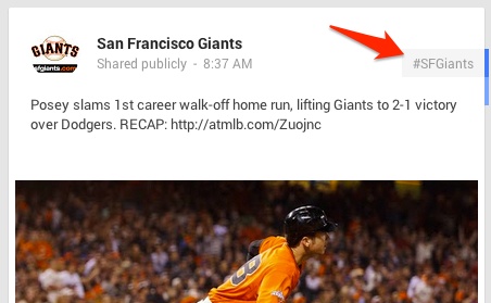 When you click the hashtag, the “card” will flip around to help you discover similar content. In the example of the Giants post, Gundotra showed me that Google automatically figured out that the post was about Buster Posey, since the company has deployed its photo-recognition technology on posted items. The image shared with the Giants post is of Buster Posey, naturally. By not taking you to a new stream of content when clicking around, Gundotra says that the context of what you’re interested in learning more about is preserved.