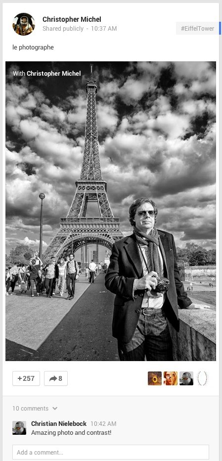 Another example of this automatic categorization is this picture of the Eiffel Tower. Gundotra explained that even though there was no text within the post that stated the origin of the photo, Google was able to figure out what it was, thus giving it the hashtag #EiffelTower. Greyed out hashtags are the ones automatically assigned by Google, and blue ones are the ones added by the sharer themselves: