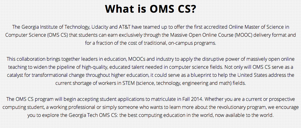 Granted, 2U has been doing this for several years with graduate programs in nursing, education, law, business and international service. However, Udacity’s partnership is significant because it’s the first to take MOOCs not just to graduate programs, but to computer science.