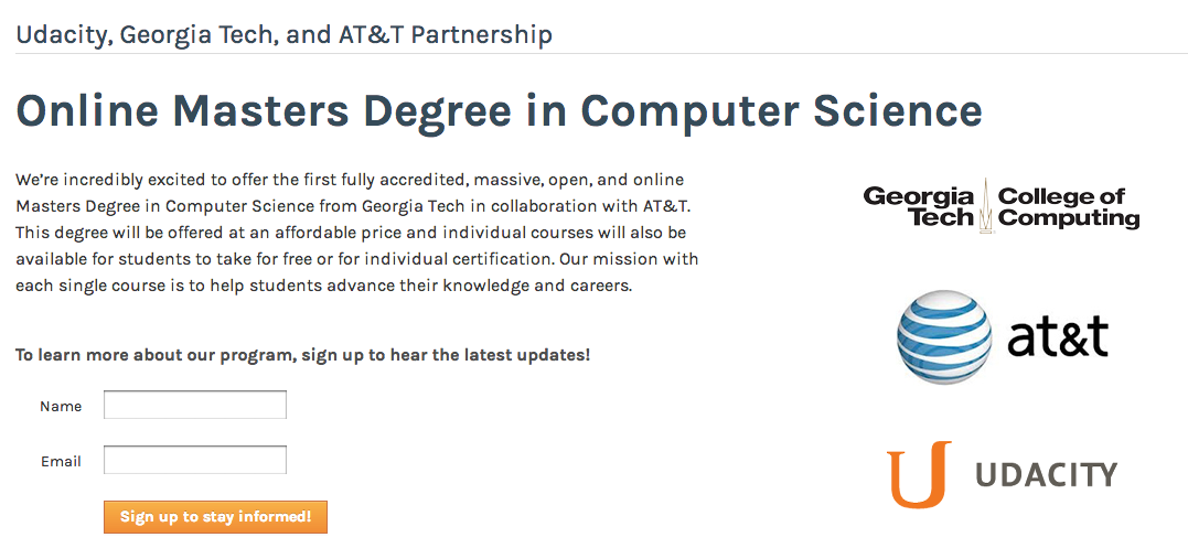 Again, while the idea itself isn’t new, and Udacity isn’t the first to partner with an elite graduate program to provide quality education and an actual, graduate-level degree to students online, the quality of the academic program (and presumably its content), its focus on Computer Science, combined with its relative affordability and the ability to receive credit and complete a full, graduate-level degree online, is absolutely huge. Sure, the launch is still quite a ways off, which is at once makes the announcement perhaps a little bit premature, but is also evidence that they’re taking the development of this program seriously. No status quo.