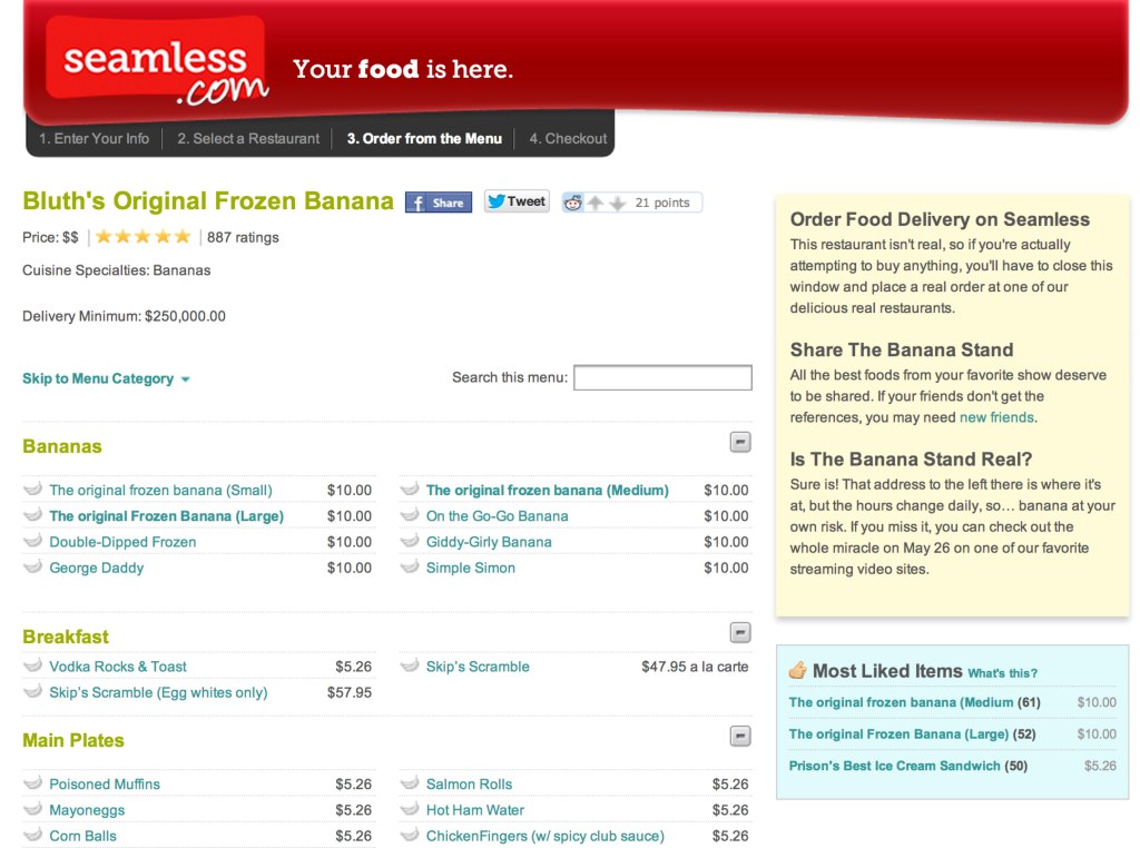 The latest to get in on the action is Seamless.com, which has partnered with Netflix to offer an ordering page for “Bluth’s Original Frozen Banana.” If you don’t know what that is, then go watch the show, I guess.