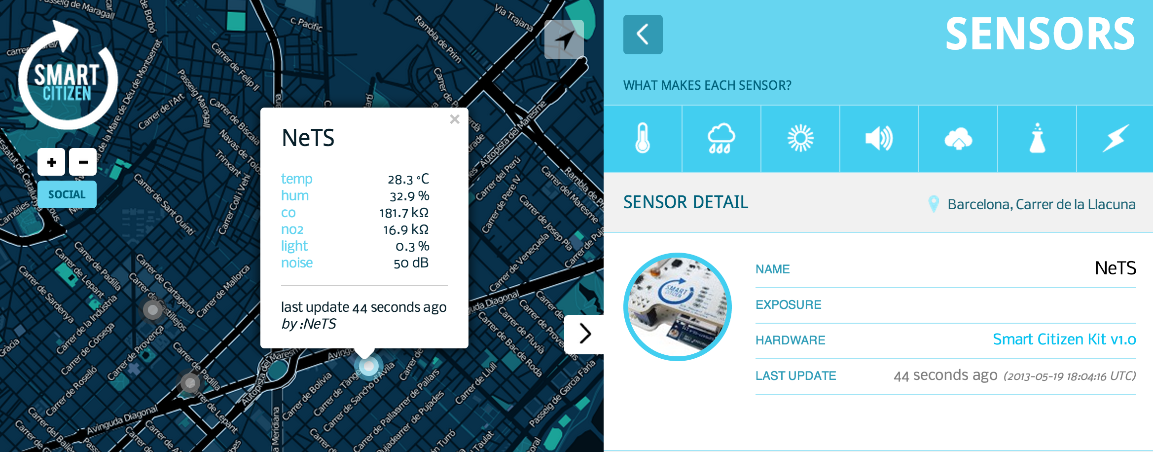 As it happens, a few of those Smart Citizen kits have already been fired up. A quick look at a demo version of the sensor-tracking website reveals that a handful of the little things are live in Zabala’s native Barcelona — the Smart Citizen team ran an earlier, more local crowdfunding campaign (Zabala called it a “proof of concept run”) that saw a number of users in Spain install and fire up their sensor arrays all around the city. Hovering over a bright blue spot displays the latest environmental data (users can define how often they want those updates to occur), while greyed out units haven’t been fired up lately.