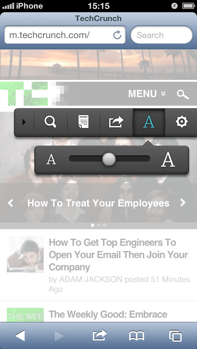 Once the Brow.si code has been integrated into a mobile website, the site gets the Brow.si toolbar added to it. Clicking on the toolbar reveals a row of buttons incorporating the new features, which include sharing the page to multiple social networks, a read it later option that ties into Pocket and Readability, and the ability to adjust font size. Further mini-apps are on their way, too. These will come from third-party developers that Brow.si hopes to attract, thus creating a marketplace as part of the platform.