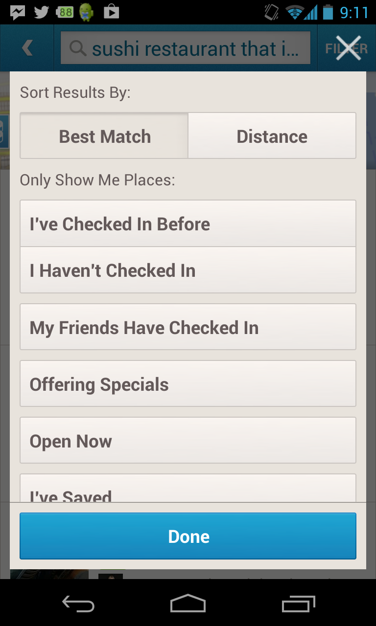 In its blog post today, Foursquare “dares” you to get “super specific” with your searches. Basically, the company is saying that they have enough data to find any place that you could imagine. One of the example searches is: “A cheap sushi place that’s nearby and open now, but that I haven’t been to yet.” Again, this is a search performed based on all of the data that Foursquare has collected over the years, but its first move into a more conversational search experience. Companies like Google are jumping on this bandwagon as well.