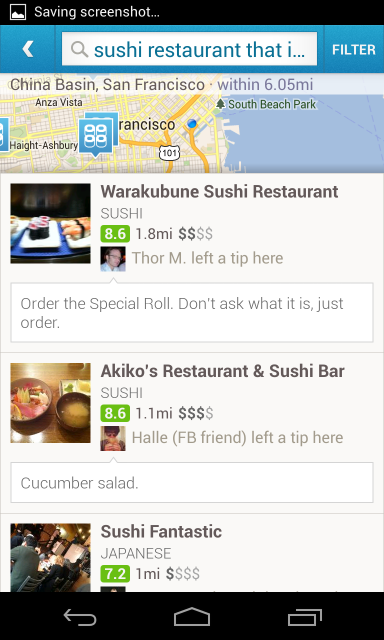 The filter options make all of this data more manageable and of course, usable, to get you to try out more places. It’s also an incentive for more businesses to adopt Foursquare’s offerings, such as specials. If people start filtering their searches in the way that Foursquare suggests, then it behooves these restaurants and bars to have multiple specials lined up and ready to go. Think of it as a highlighted ad in Google search.