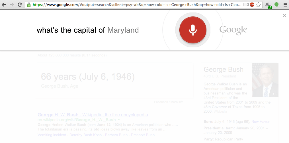 Conversational search is available in the latest stable build, and can be accessed by going to Google’s homepage and clicking the microphone icon in the search bar. So far, I haven’t run into a single connectivity issue or mistaken query, but let us know if your experience differs. Also, Chrome itself wouldn’t detect the update to version 27 on my Mac, so you may have to go direct to the Chrome website and reinstall altogether to get this up and running.