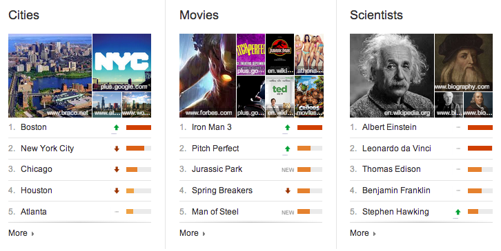 Every year Google creates a summary Zeitgeist feature to sum up the year in search data, showing what has been the most popular among its users. Now, it’s rolling out Top Charts, a new monthly series of lists similar to that year-end feature, available on Google Trends as of today. It’s built on Google’s Knowledge Graph, and provides a representation of the actual things people are interested in, rather than just keywords alone.
