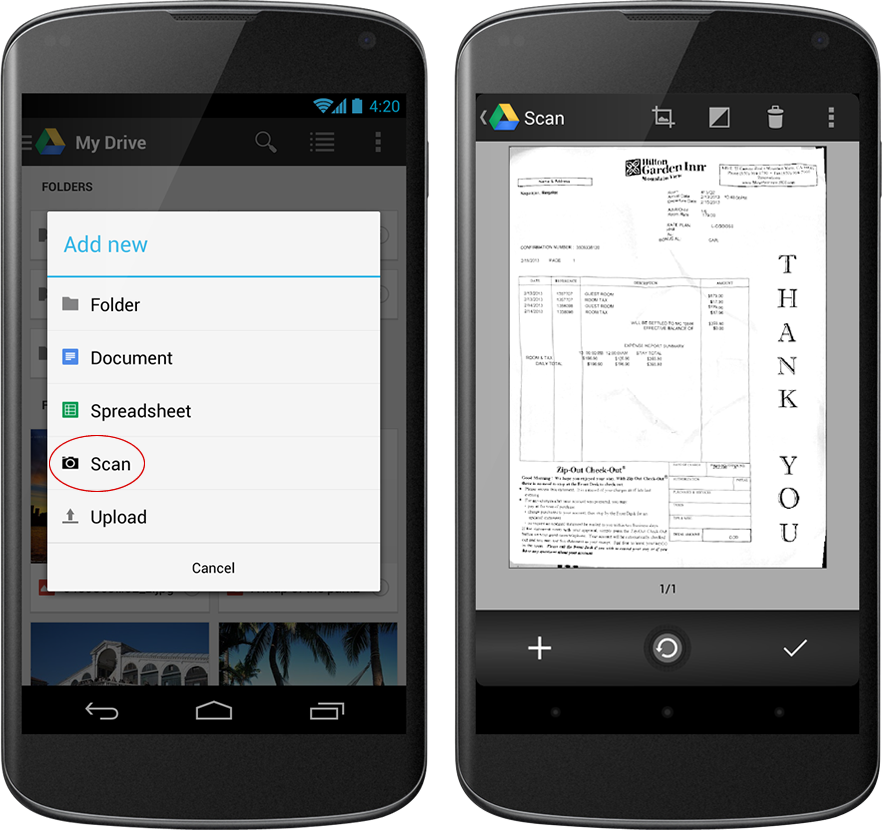The scanner tool, for example, which you can now find under the “Add New” menu, allows you to easily turn paper documents like receipts, letter and billing statements into PDFs. Thanks to Google’s advanced optical character-recognition technology, you can also easily search them later on. This definitely feels a bit like Evernote and it’ll be interesting to see if Google will continue to go down this path in the future updates to the app.