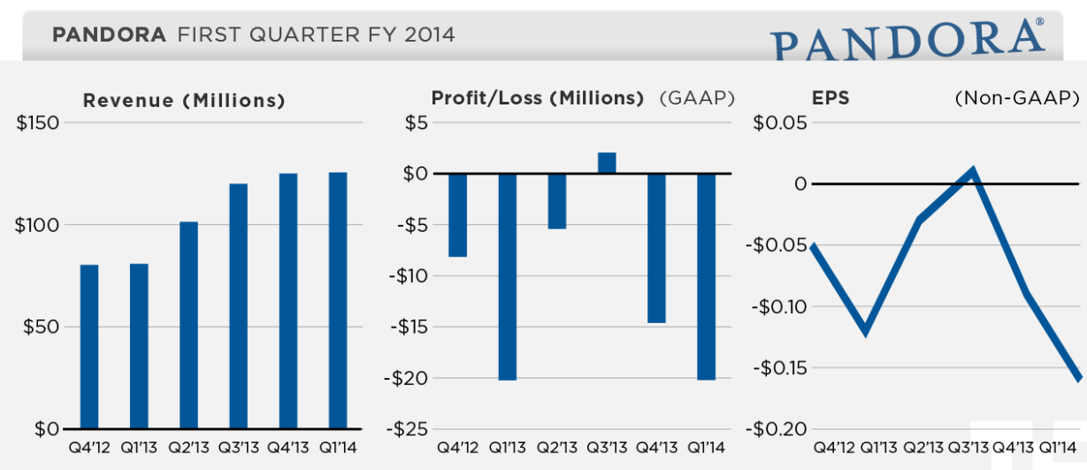 Based on this performance, Wall Street expected the trend to (mostly) continue for Pandora in the first quarter, with forecasts pegging revenue at $123.9 million (on losses of $0.10 per share) for the quarter, compared to a loss of $0.09 per share for Q1 last year — and revenue of $123.5 in Q4. And so it did.