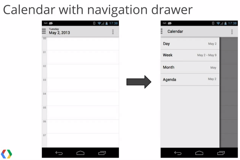 Currently, Google uses what it calls a “spinner,” the drop-down menu at the top of the screen you’ve probably seen in numerous Android apps. Instead, as Google’s Jens Nagel showed during his presentation, the new design would use a navigation drawer that users can pop out from the left side of the screen.