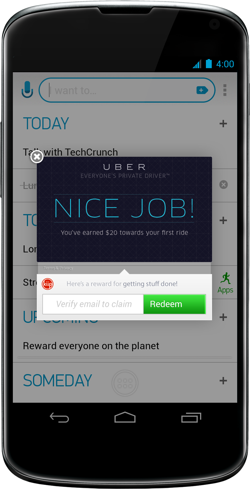 Users of Any.DO are pretty happy about it, even tweeting about what they’ve just earned. Think about that for a second…an app user tweeting an advertisement. That’s what has made Kiip an interesting solution for developers looking to monetize, without giving up real estate and user experience for ugly banner ads.