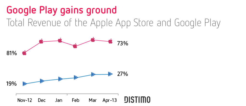 In November 2012, Google Play only accounted for 19 percent of the revenue generated by the two major app stores combined (Apple’s App Store and itself), but this April, that share has jumped by 8 percentage points to 27 percent.