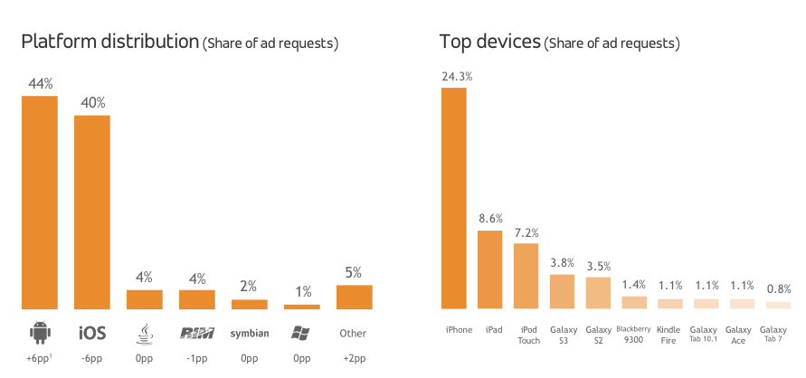 The iPhone and iPod touch together account for over a third of all ad requests served by Adfonic, which sees hundreds of billions of impressions on a monthly basis. Both of those devices saw share slip for the quarter vs. the fourth quarter of 2012,by two points and six points respectively, but Samsung remained flat even though it has six devices in the Adfonic top ten now. Combined, Samsung has only around 12 percent of the overall share, but its CTR is strong and getting stronger.