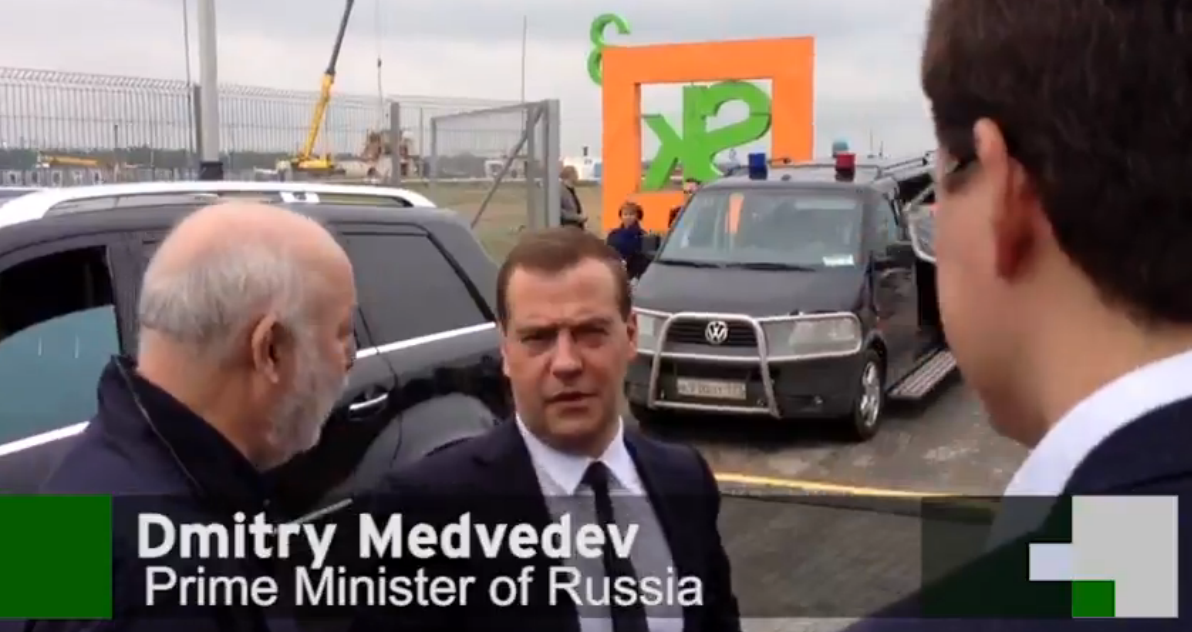 But the weather and the lack of any red carpets was not enough to put off Prime Minister Medvedev, who toured the event listening to pitches from companies, trying out products on display and talking to officials (though as you’ll see from our video we had a hard time trying to get an interview).