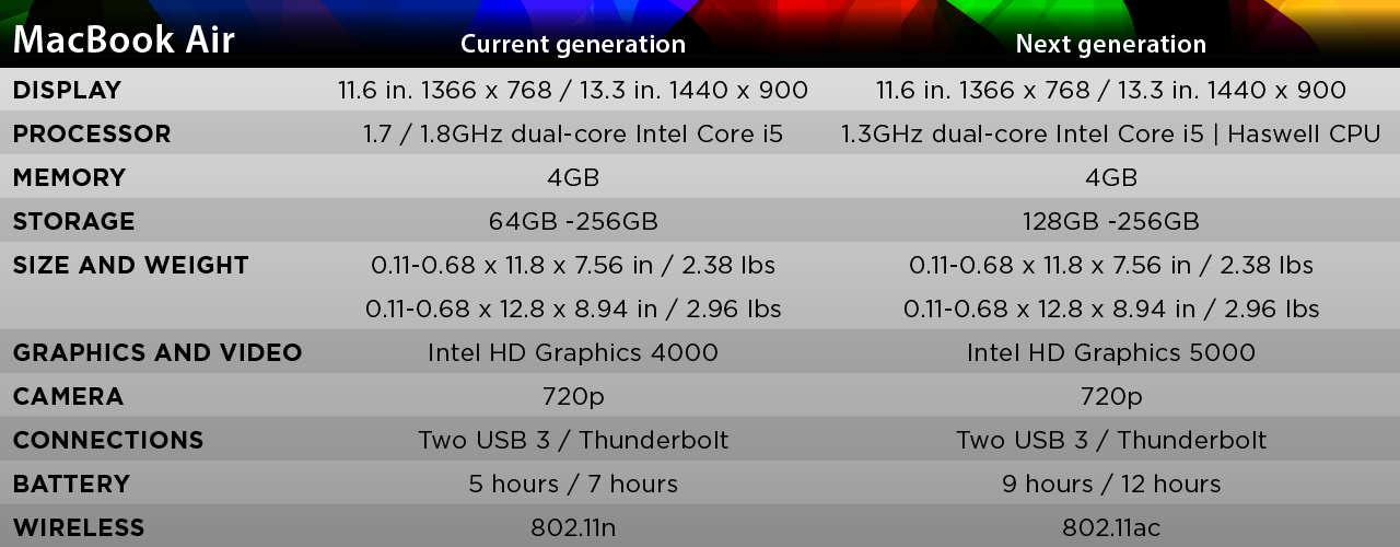 Update: Apple’s website is now up to date, and sadly the new MacBook Air now comes with a Core i5 1.3 GHz across the board. Haswell CPUs are more efficient, especially for graphics performances. A dedicated GPU is now almost redundant for casual web surfing and office usage. It could explain the great battery performance while we await some benchmarks.