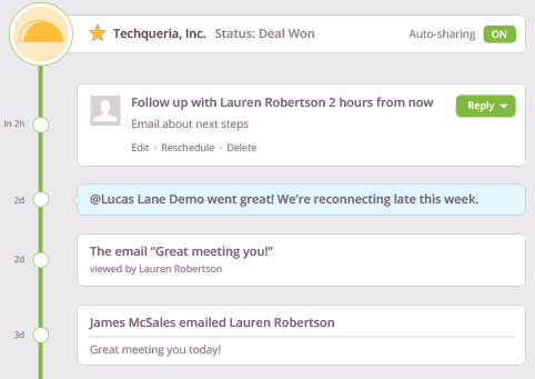 It does that by automatically capturing data from email, voice, social networks and calendars and analyzing language in those communications to identify words and phrases in an email that might indicate a lead is getting ready to take the next step, or just the opposite. In other words, the idea is to reduce the amount of work you have to do and only surface the critical stuff you can’t ignore.