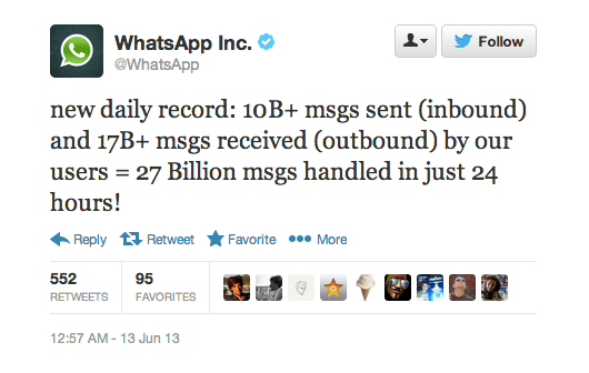 Along with Skype, WhatsApp is the granddaddy of the mobile messaging app space. But despite its relative great age (~47 months), certainly compared to the myriad messaging newcomers, it appears to be continuing to build usage momentum. Earlier today WhatsApp announced a new daily messaging metric record, following on from its recent “bigger than Twitter” boast. Its new daily high is 10 billion+ inbound (sent) messages and 17 billion+ outbound (received) messages — making for a total of 27 billion+ processed missives in 24 hours.