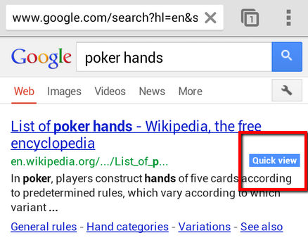 In April, Google announced a couple of new features that were meant to speed up mobile browsing. Among them was “Quick view,” an experimental feature that added a badge to Wikipedia results on Google’s mobile search results pages that, when you clicked it, loaded the Wikipedia result in around 100 milliseconds. Now, however, it looks like these Quick view badges were indeed just experimental and have quietly disappeared from Google’s mobile search results pages.