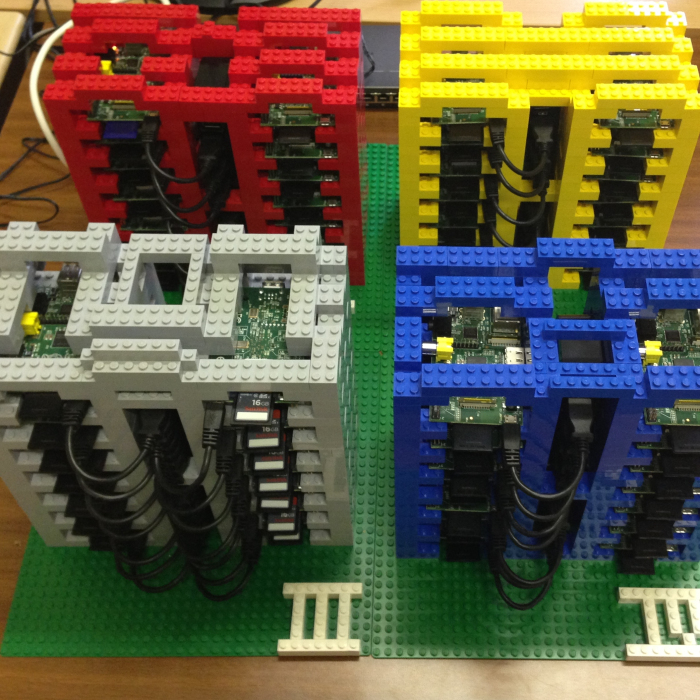 The 56 Raspberry Pis in PiCloud are stacked in four mini Lego racks, each topped off with a top-of-rack-switch which has 16 Ethernet connections: 14 used to network the Pis and the other two for connecting the switches. At the software stack layer of PiCloud, each Pi board is running Raspbian Linux, with three LXC containers per Pi each running a Linux instance.