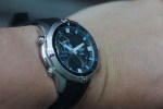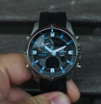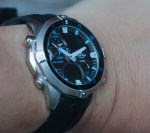 So what’s special about the EMA100? First, it is surprisingly staid and classic for a “water watch.” The face is quite dark and the two LED registers — one at 6 o’clock and one at 2 o’clock — are reflective and nearly invisible in low light. Even the blue LED backlight is better at lighting up the luminous hands than the actual registers. The Edifice line uses polished metals to great effect, giving what would be a normal, albeit rugged, quartz piece a bit of class.