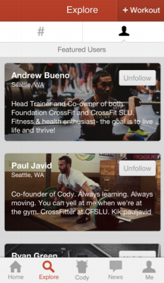While there’s value in being able to browse through a shared workout feed to check in on what your friends are doing, a key part of creating a social fitness experience and a “fitness graph” like this is discovery. And up until now, that’s largely been missing from Cody. But today, Cody is adding a new feature called “Explore,” which makes it easier to discover people and workouts, and browse through other Crossfitters, yogis and weightlifters with one tap.