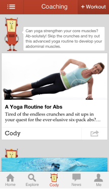 Explore intends to make it easier to find and follow people by grouping them into categories, so that you can search and discover workout pals by activity, Featured Users or Featured hashtags, like “#5K,” for example. Like Edomondo and other apps, Cody has also set out to add value to its fitness network by acting as a virtual coach.