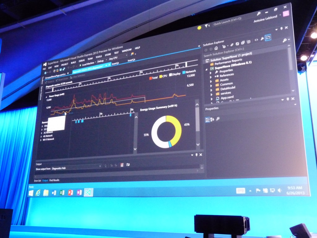 Microsoft showed the new Visual Studio 2013 at its Build developer conference today. The new integrated development environment (IDE) features include performance tools for power consumption, asynchronous calls for debugging and an overall focus on the connected app.