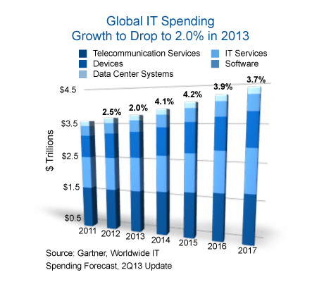 The $3.7 trillion in IT spend in 2013 represents a downward revision from where Gartner thought we would be today: compare to last quarter, when Gartner noted growth of 4.1% for this year; that is now more than halved. (You can see comparative projections here.) One of the main reasons for this, Gartner notes, is because of currency fluctuations. In constant currency, growth would still be down compared to 2012, but less so, to 3.5%.